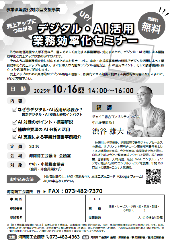 そのような事業環境変化に対応するため本セミナーでは、中小・小規模事業者の皆様がデジタル活用によって業務効率化と売上アップを目指し、すぐに導入が可能なデジタル活用方法、AI の活用ポイント、そして顧客獲得に役立つSNS 事例をご紹介します。