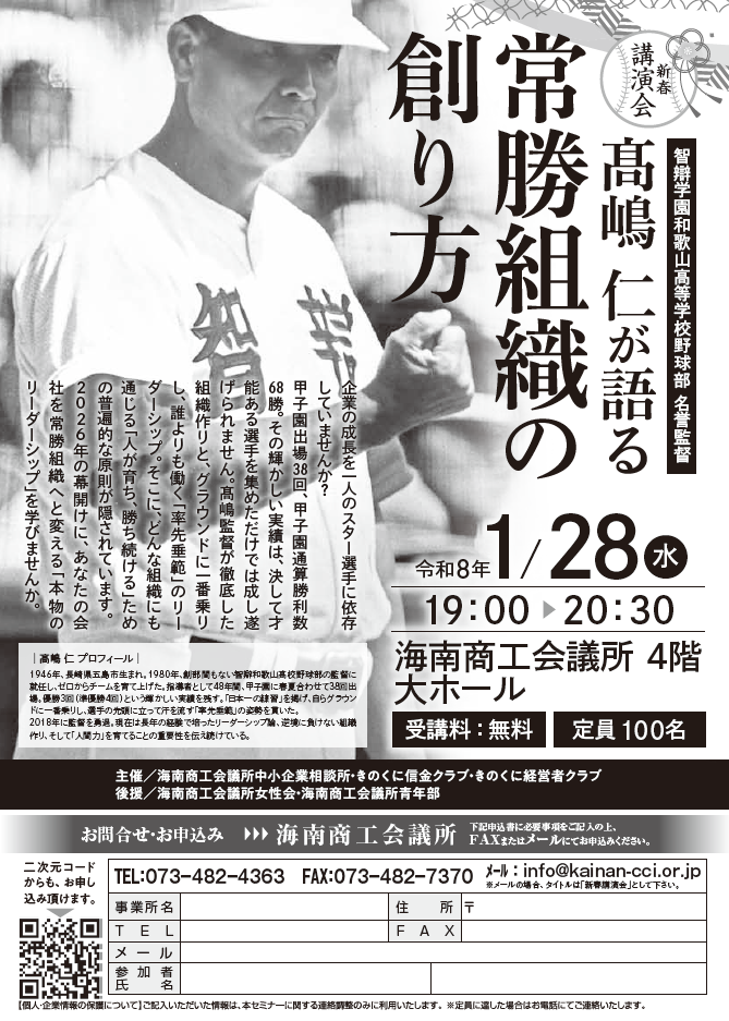 海南商工会議所は、きのくに信金クラブおよびきのくに経営者クラブと共催で新春講演会を開催します。
